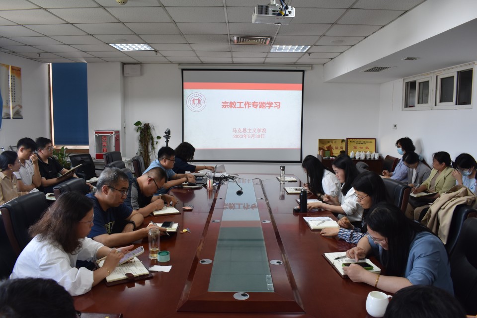 修彩波带领全体教职工集体学习了习近平总书记关于宗教工作的重要论述、《学校宗教工作知识手册》、《师生应知的宗教工作常识和政策法规》等学习内容。修彩波结合学校文件和学院工作实际对本学期做好与宗教相关的工作提出了明确的要求。第一,坚持以马克思主义宗教观为指导,深入贯彻落实党的宗教工作方针、宗教信仰自由政策、教育与宗教相分离的政策,进一步提高理想信念和政治站位。第二,坚持和巩固马克思主义在意识形态领域的指导地位,坚守思政课意识形态阵地。第三,自觉履行思政课教师职责使命,坚决杜绝涉及宗教问题安全隐患。