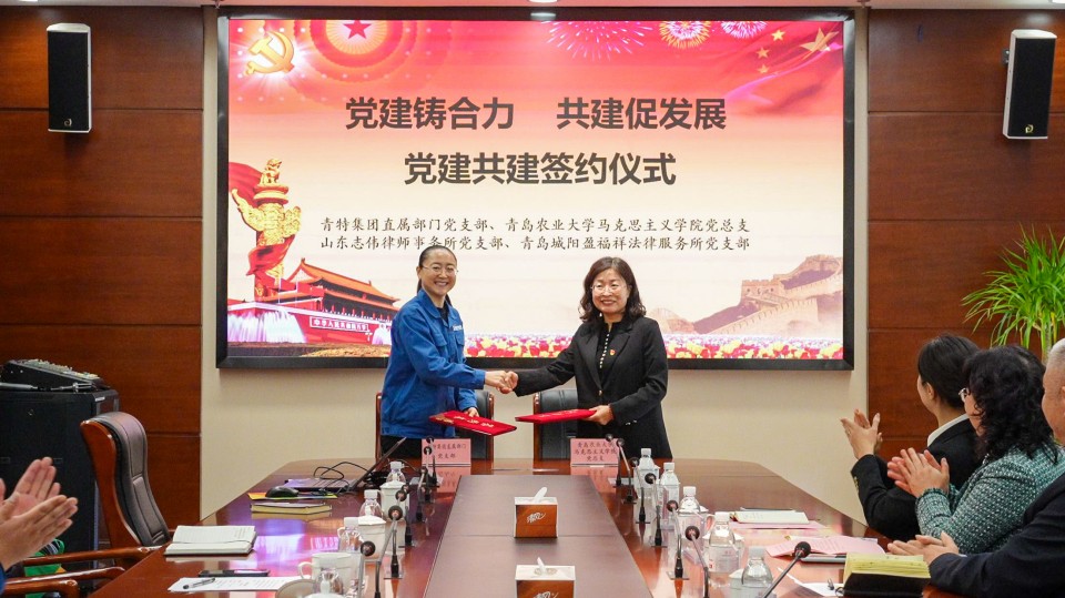 学院党总支书记修彩波、青特集团有限公司直属部门支部委员会书记纪国清、山东志伟律师事务所党支部书记王雅正及青岛城阳盈福祥法律服务所党支部书记姜蓝英出席签约仪式,并签订了合作共建协议。青岛市城阳区法律服务行业党委书记王宪成为共建单位颁发共建纪念杯。