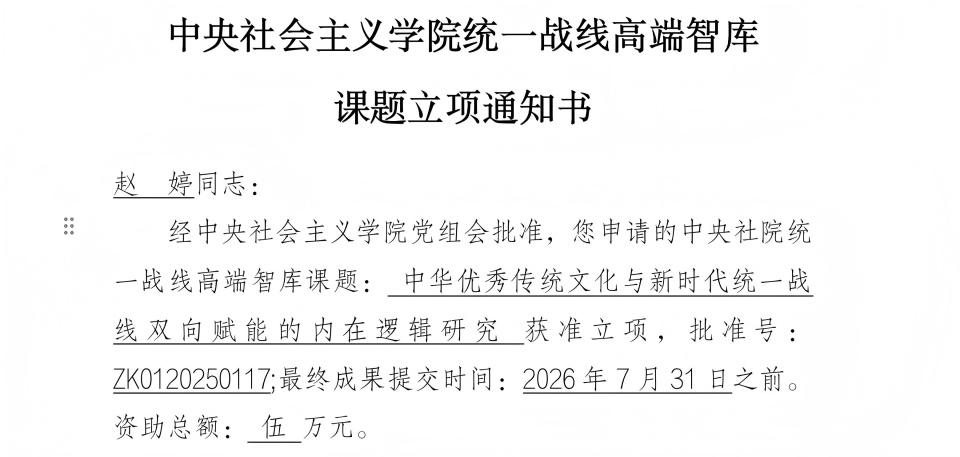 中央社会主义学院统一战线高端智库于2016年正式成立,是中央统战部批准建立的国家级统战理论政策研究平台。中央社院统一战线高端智库课题是中央社院加强科研创新,推动统战理论政策和对策研究,为党和国家工作大局服务的重要举措,是以习近平新时代中国特色社会主义思想为指导,深入贯彻习近平总书记关于做好新时代党的统一战线工作的重要思想,聚焦新时代统一战线理论与实践、中华文化与文明交流互鉴、强化政治共识和政治共识教育、统一战线教育培训工作等方面开展研究的前沿阵地。赵婷此次申报的研究项目立足中华优秀传统文化与统一战线双向赋能逻辑,为新时代统战工作高质量发展提供文化支撑,同时也为传统文化的传承与创新拓展实践路径。