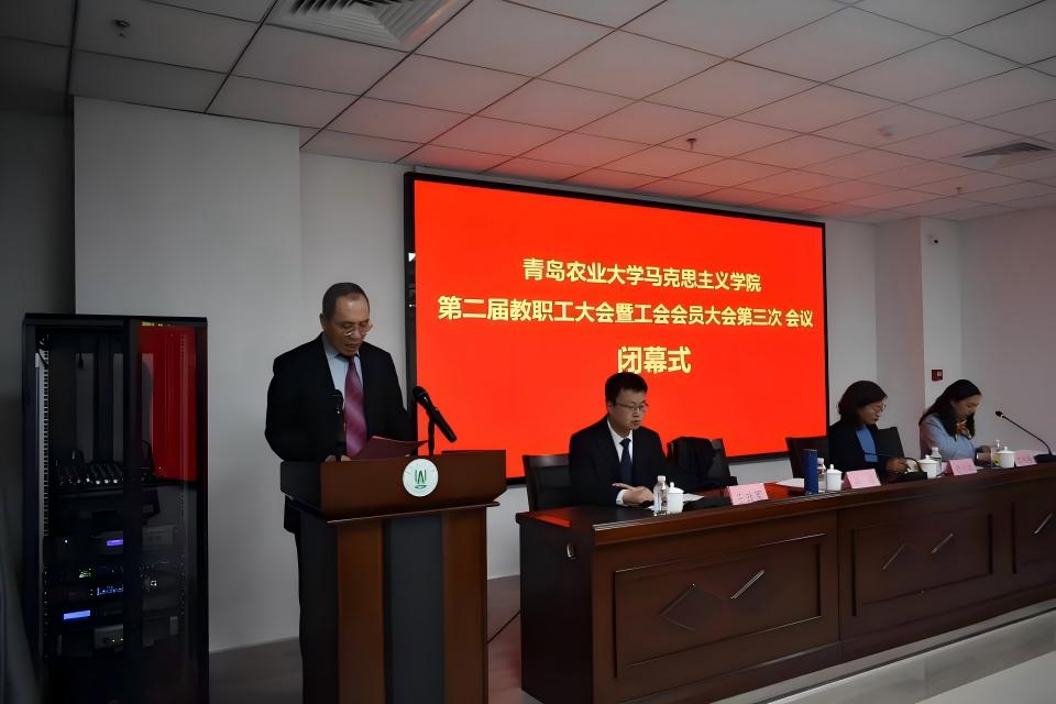 学院党总支书记韩强致闭幕词。他指出,本次大会民主务实、高效有序,是一次团结奋进、开拓创新的大会,更是一次鼓舞干劲、砥砺前行的大会,为学院下一阶段高质量发展奠定了坚实的思想基础和制度保障。他强调,全院上下要把思想和行动统一到大会的部署安排上来,把智慧和力量凝聚到大会确定的各项目标任务上来。他提出四点希望与要求:一是要坚定政治方向,筑牢发展根基。必须旗帜鲜明讲政治,始终把党的政治建设摆在首位,确保学院发展沿着正确政治方向前进。二是要聚焦核心目标,狠抓工作落实。锚定目标任务,细化工作举措、压实工作责任,确保年度目标任务圆满完成。三是要坚持以人为本,凝聚奋进合力。坚持以教职工为中心的发展思想,关注教职工的成长发展,不断增强教职工的归属感、幸福感和凝聚力。四是要勇于担当作为,彰显马院本色。牢记为党育人、为国育才的初心使命,牢固树立和践行正确政绩观,彰显马院的责任与担当。